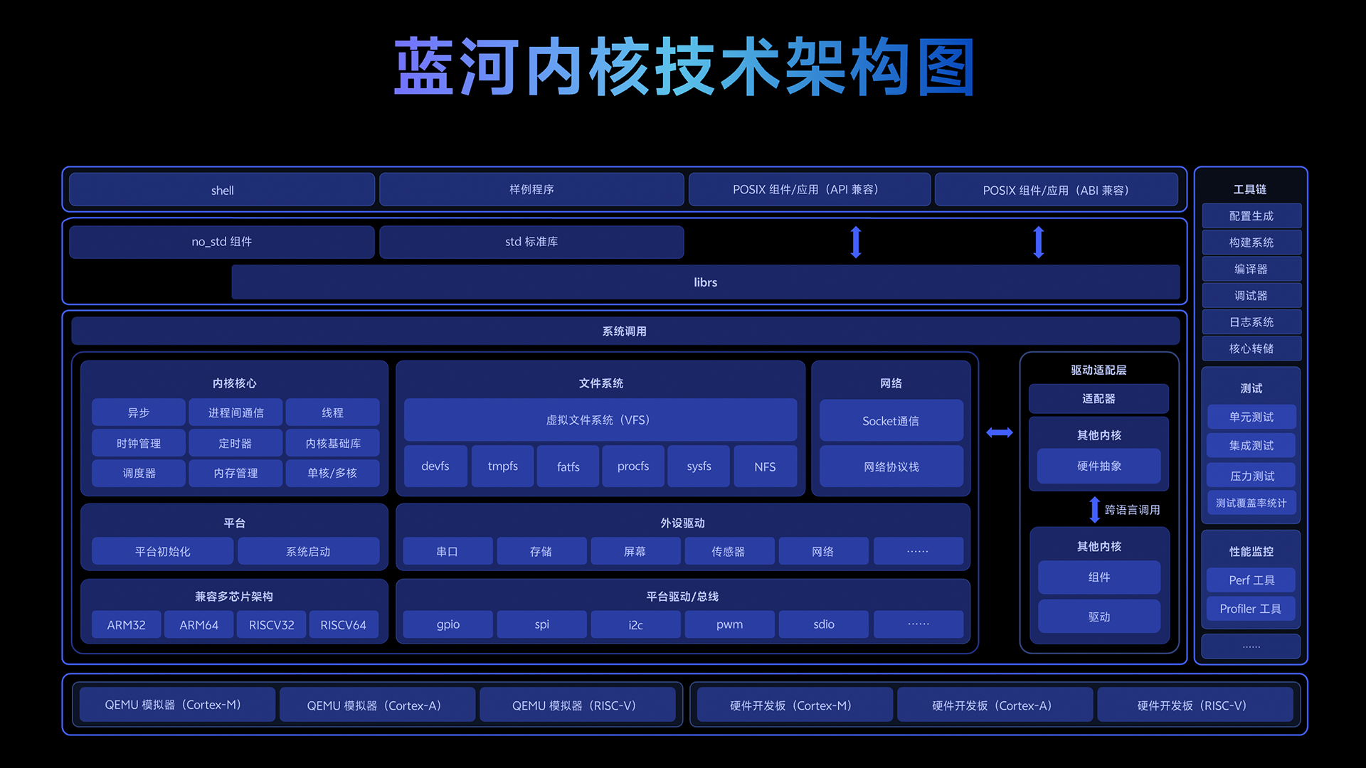 蓝河内核的文件系统则采用了经典的层次化结构设计,实现了对文件和inode等数据结构的抽象操作,支持快速适配不同的文件系统;而对于网络,支持基础的TCP/IP协议栈,能够以阻塞模式和非阻塞模式调用,支持接入多网卡设备,也基于Rust Zero-Copy 零拷贝设计,消除数据传输过程的堆分配开销,支持了 socket api;设备管理上,蓝河内核通过硬件抽象等一系列方式,提升了对于CPU架构和驱动的兼容能力,支持Rust语言开发驱动,也支持兼容已有的C语言内核的外设驱动。