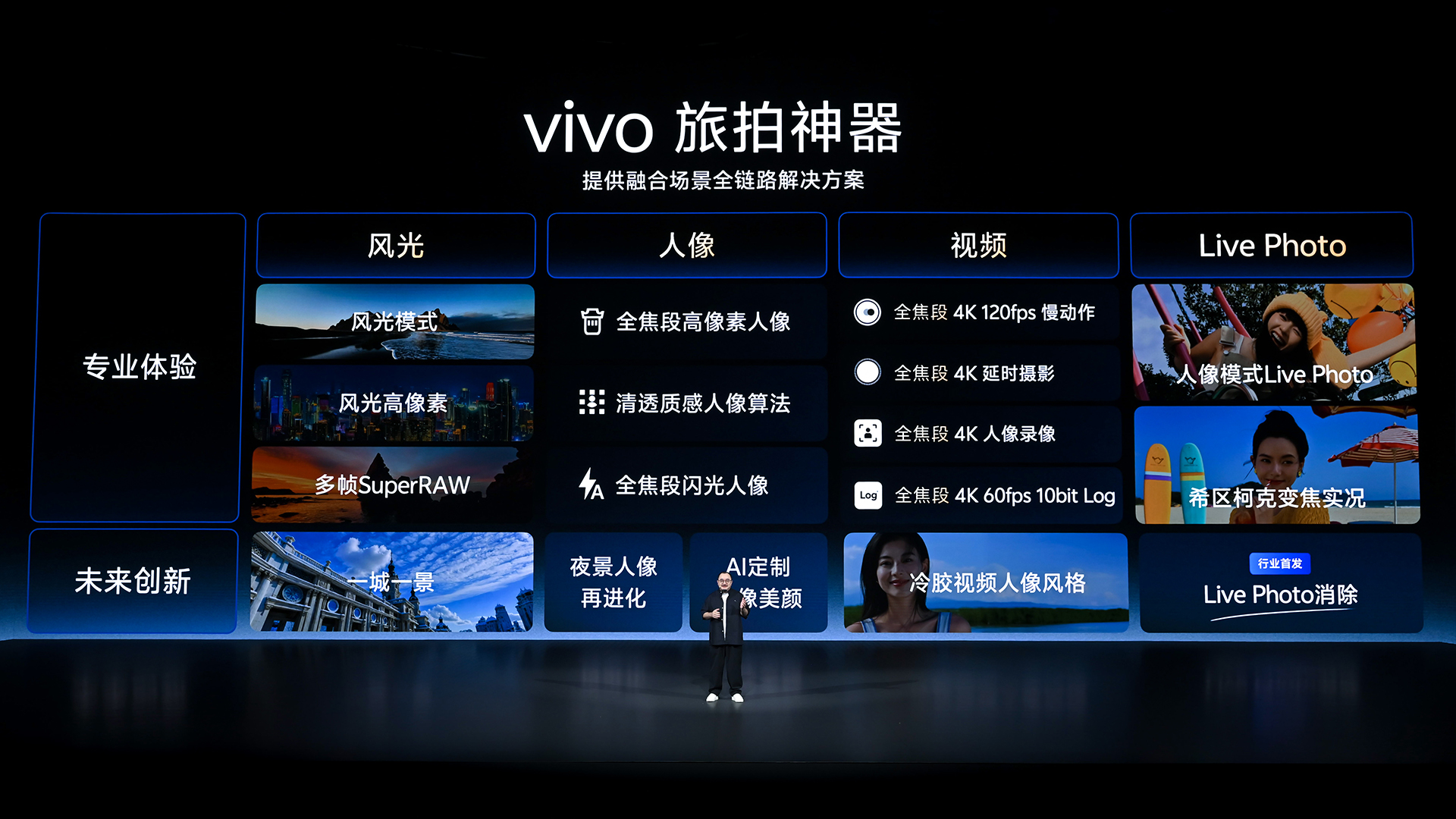 vivo提供融合场景全链路解决方案视频方面,vivo实现了全焦段4K 120fps慢动作、全焦段 4K 人像美颜美型和全焦段4K 60fps 10bit Log,行业首发人像模式Live Photo及Live Photo消除功能,以更强大的全链路影像实力,为用户定格拥有瞬间生命力的美好时刻。vivo还将不断推出“冷胶视频人像”等风格化视频模板并首发自研AI定制美颜,满足年轻人多样的创作需求。