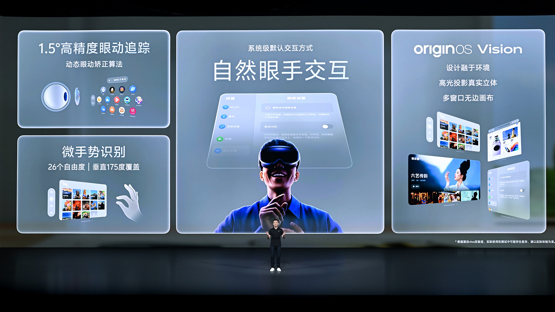 vivo Vision探索版vivo Vision探索版自然精准的操作体验,让交互轻松上头。产品搭载了基于“负设计”理念的全新OriginOS Vision系统。源于大自然的灵感让图标和窗口格外真实地存在于用户眼前,信息的呈现不再被困于小小的屏幕,而是自然地浮现在周围的空间中。操作方式从“隔着屏幕点”,变成了“眼一看,手一动”,准确无误的掌控空间。历时四年的深耕打磨,vivo Vision探索版实现了1.5°高精度眼动追踪,相当于站在2米外看1块手表大小的精准定位,加上26个自由度的指尖级手势识别和垂直175度的识别范围,为用户带来了自然精准的交互感受。