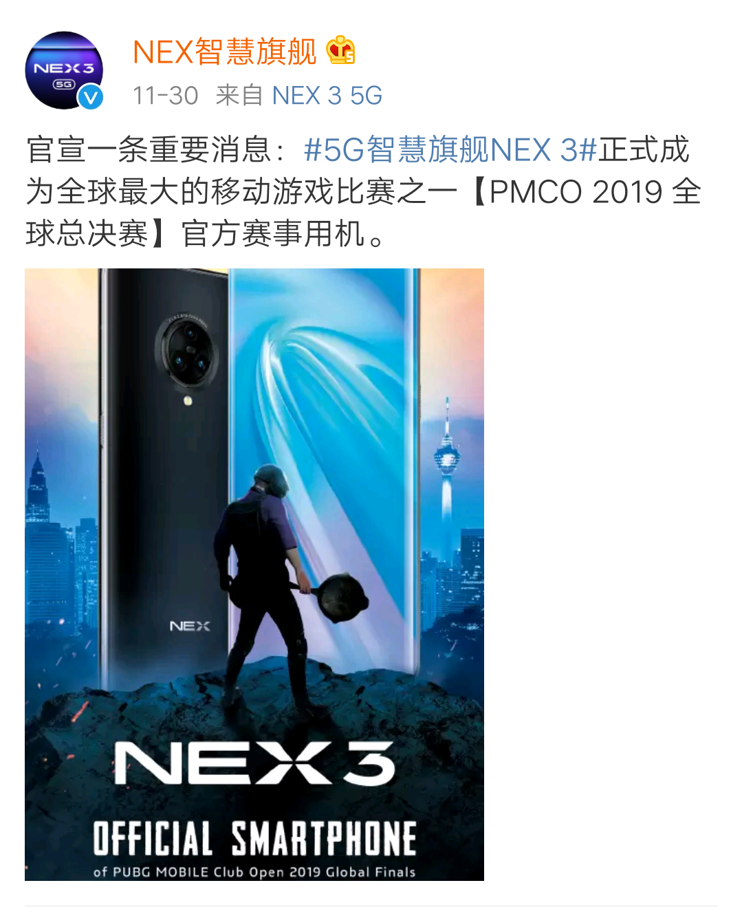 随着手游画质、音效、可玩性的提升,这就需要一部性能强悍的手机。近日,NEX智慧旗舰官方微博宣布,NEX 3 5G成为了PMCO 2019全球总决赛官方赛事用机。