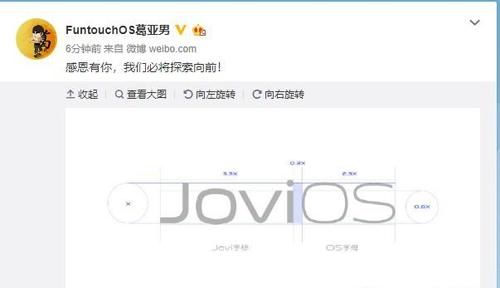 相信大家在选择手机的时候,除了拍照、外观和性能外,系统也是非常重要的一个考虑因素。目前,国内众多手机厂商都在全力打造手机系统,这其中就有vivo。近日,vivo Funtouch OS项目经理公布了“Jovi OS”LOGO的设计图,并配文:“感恩有你,我们必将探索向前”,进而引发网友的关注。