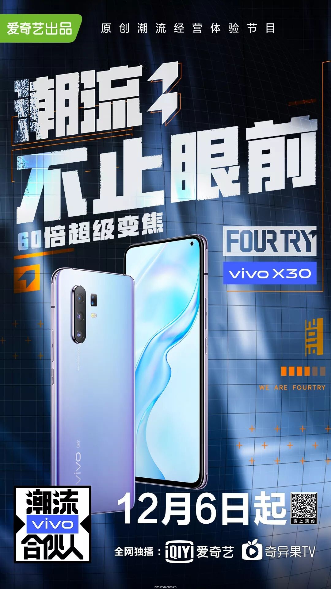 昨日,爱奇艺自制vivo潮流合伙人欢乐来袭,吴亦凡、杨颖、潘玮柏等潮流大咖齐聚。而眼力独到的vivo早已加盟,成为了FOURTRY的战略合伙人,用60倍变焦超远摄,让每个人都能拍出潮流大片。