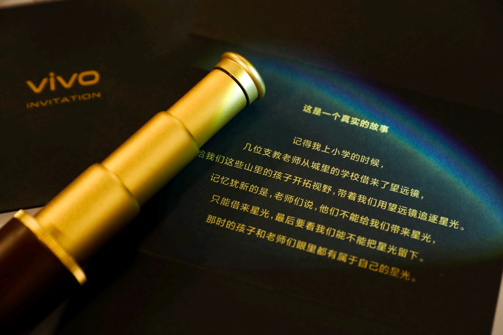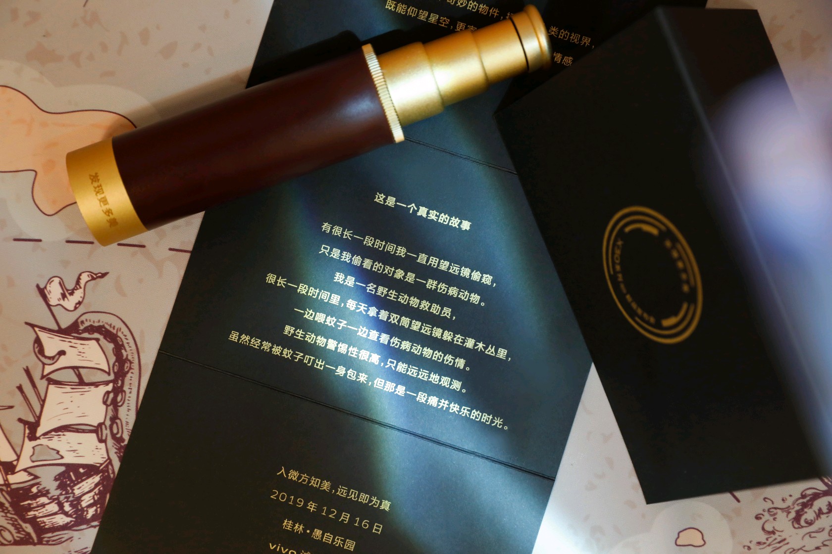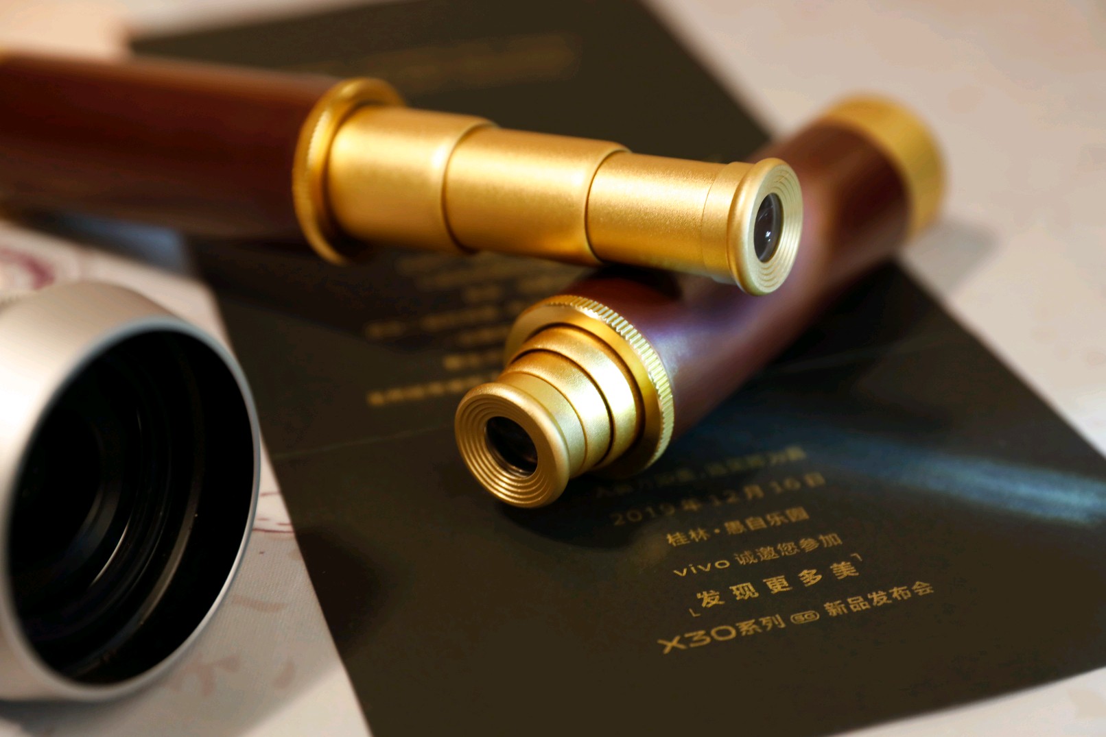 望远镜作为一个奇妙的物件,它用高倍的视角拓宽了人类的视界,帮助我们洞察到世间的美好。而vivo X30系列发布会选择用可伸缩的单筒望远镜作为邀请函,其镜身上印刻着“发现更多美”字样,也延续了过往X系列的调性。