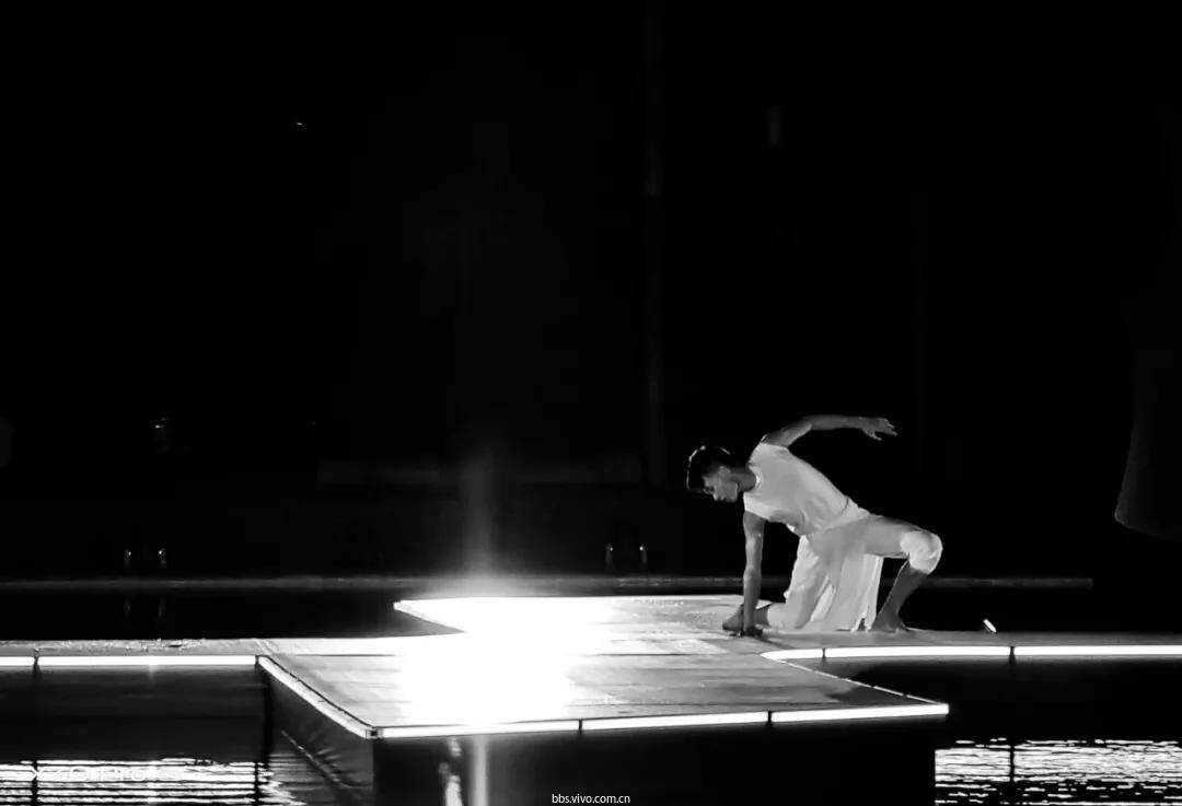 夜幕降临,发布会即将开始,舞者现场起舞预热,摄影师在看台通过长焦拍数十米外的舞者。