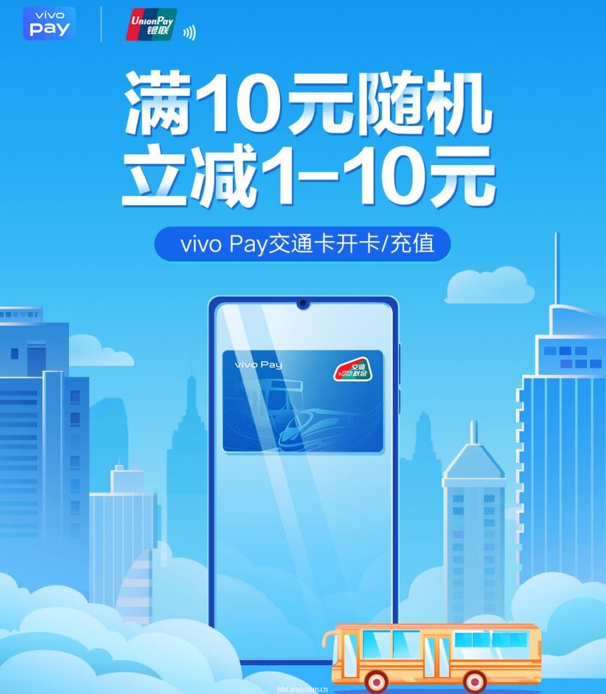 即日起到2020年2月21日,只要使用vivo Pay支付方式进行交通卡开卡/充值,支付金额满10元,就可享受随机减1-10元的福利。同一用户每天可享受1次优惠,活动名额总计8万,先到先得,用完即止哟!(PS:vivo钱包需要更新至1.9.6.0版本以上)