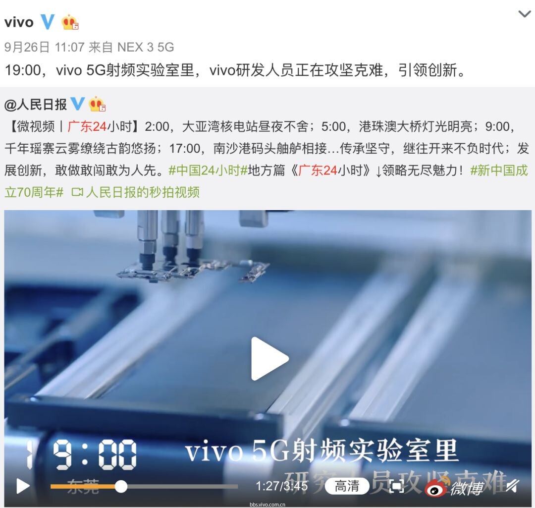 在新中国成立70周年来临之际,人民日报盘点的《广东24小时》记录片中,播放至19:00,vivo 5G射频实验室里,vivo研发人员攻坚克难,引领创新。 ▼