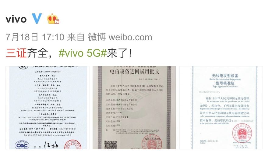 vivo 5G手机三证齐全,万事具备,只待登场。 ▼