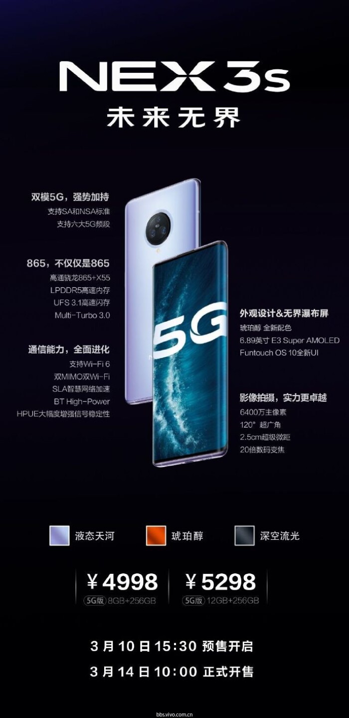 一张图了解NEX 3S 5G,3月10日线上线下同步开启预售。