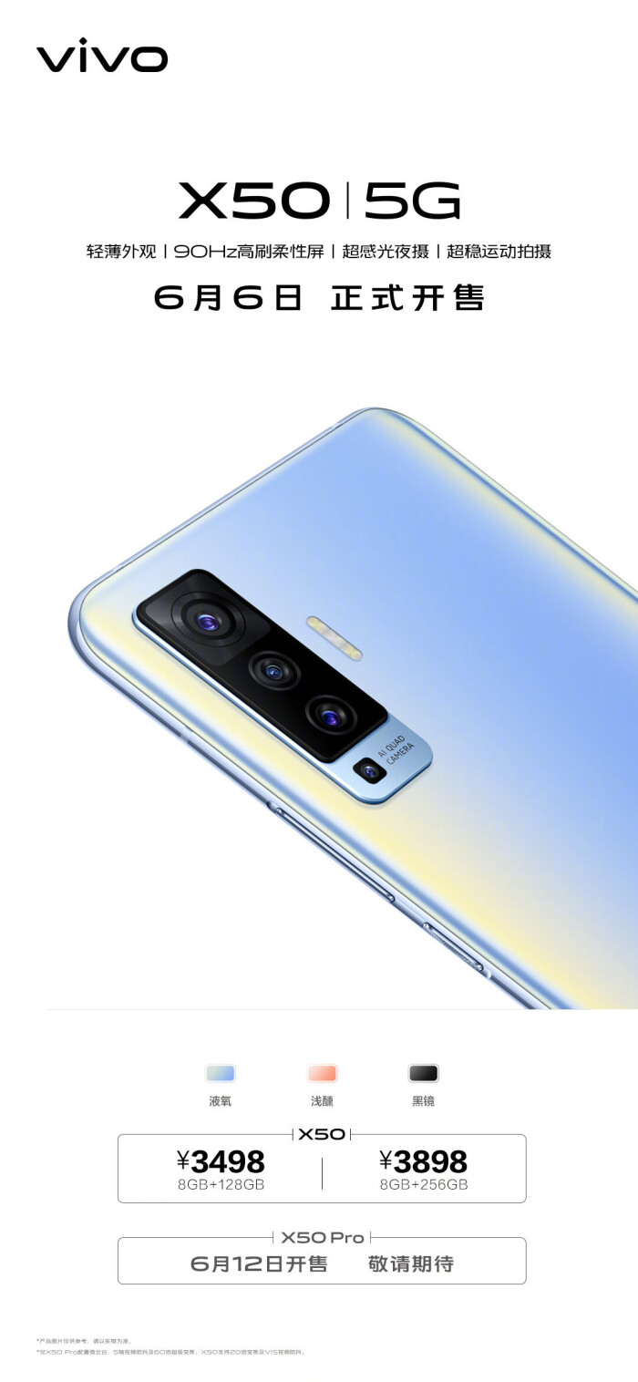 今天,vivo最薄5G手机X50全面开售。7.49mm轻薄机身,握持感极佳;高端磨砂工艺,不留指纹;液氧、浅醺、黑镜三款配色,还有超稳运动抓拍,等你体验。