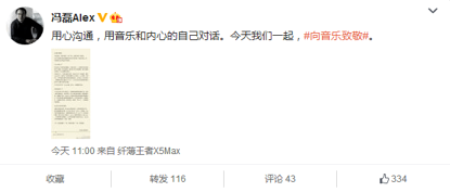 26日上午,vivo副总裁、首席市场官冯磊在自己的微博上发声:“以vivo一直所坚持的Hi-Fi&Smart、乐享极智的品牌理念,以所有热爱音乐的朋友的名义,向人类共同的情感语言——音乐,致敬!”随后再次引起包括虾米音乐、豆瓣FM;知名歌手TFBOYS、陈奕迅、周杰伦、五月天等官微以此为题发出呼应,并引发网友跟进评论,将“向音乐致敬”演绎成一场网络的“群嗨”。