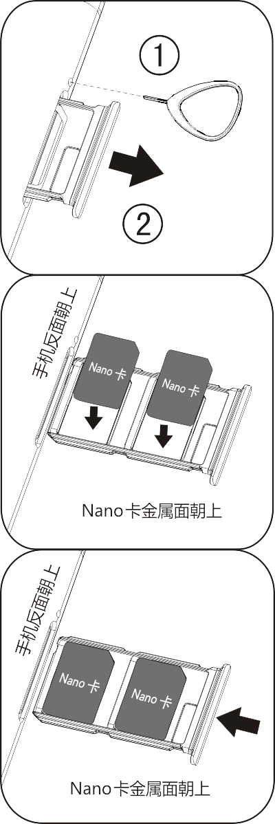 2、请先将卡1/卡2放入卡托,再将卡托装入手机。禁止将卡1/卡2直接塞入手机。