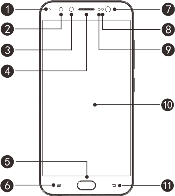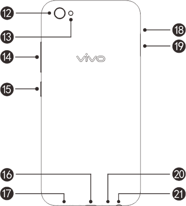 1、指示灯;2、前置副摄像头;3、前置主摄像头;4、听筒/扬声器;5、主屏键/指纹识别;6、后台键;7、自拍补光灯;8、红外;9、光敏(隐藏);10、触摸屏;11、返回键;12、后置摄像头;13、闪光灯;14、音量键;15、电源键;16、USB接口;17、扬声器孔;18、顶针孔;19、卡托;20、麦克风;21、耳机插孔。