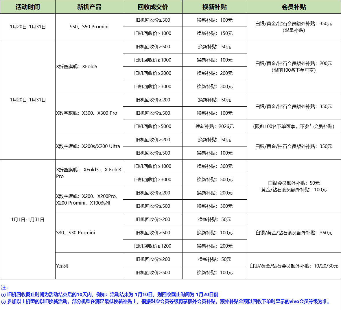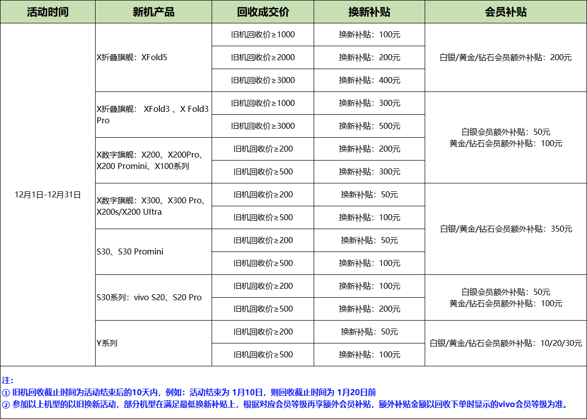 活动期间,参与vivo商城 以旧换新活动,旧设备回收成交价≥200元、≥500元、≥1000元等不同金额,并购买以下新机,可享受对应换新补贴+专属会员补贴: