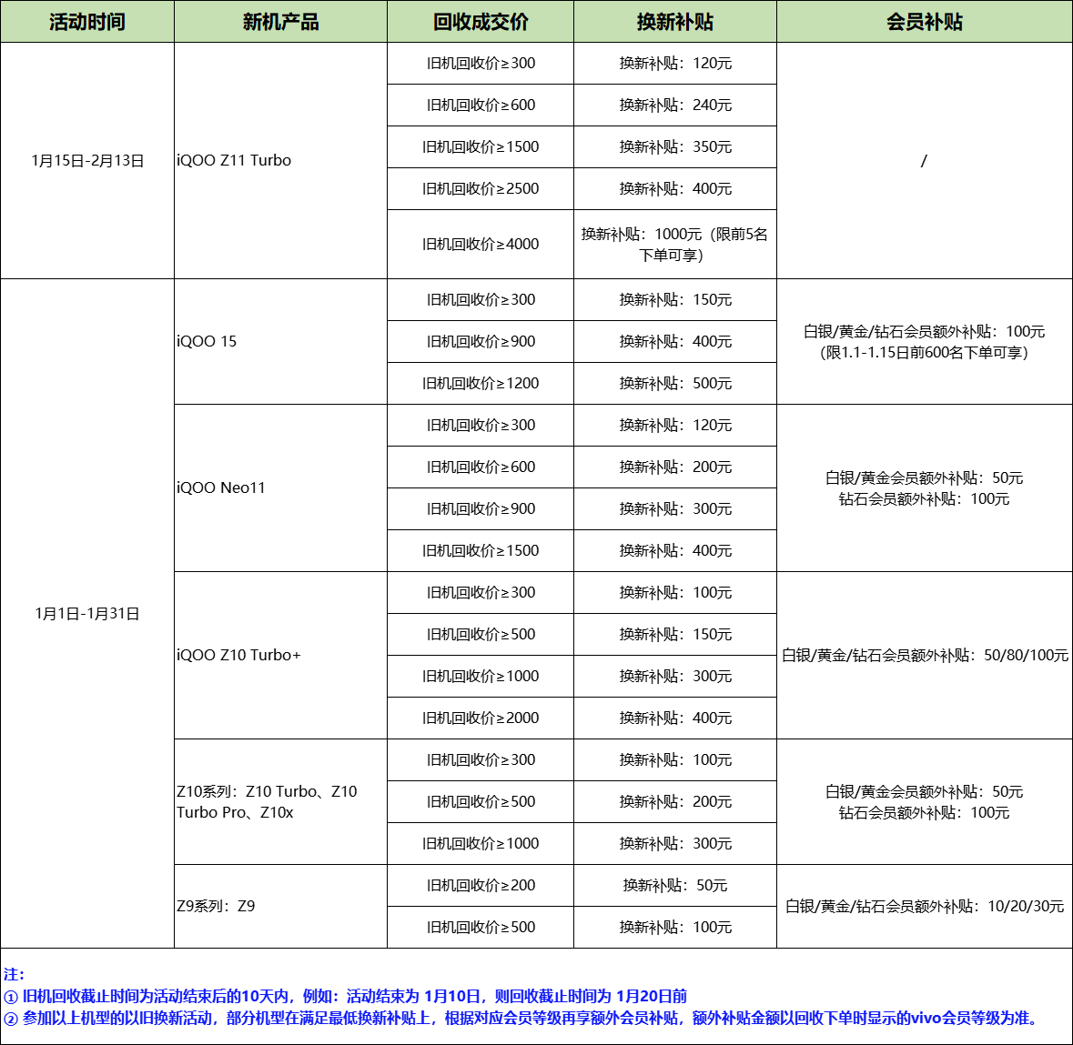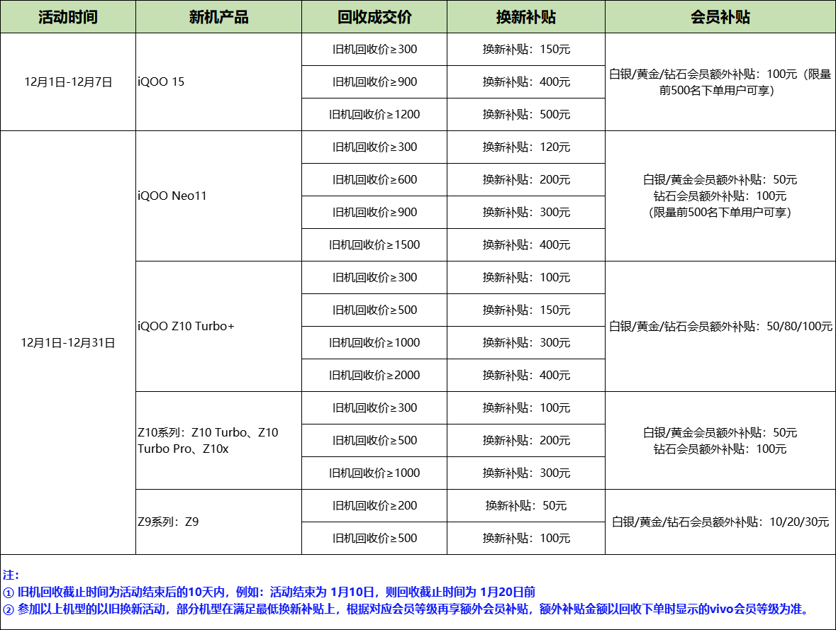 活动期间,参与vivo商城 以旧换新活动,旧设备回收成交价≥200元、≥500元、≥1000元等不同金额,并购买以下新机,可享受对应换新补贴+专属会员补贴: