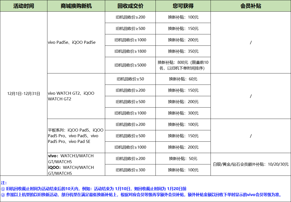 活动期间,参与vivo商城 以旧换新活动,旧设备回收成交价≥200元、≥500元、≥1000元等不同金额,并购买以下新机,可享受对应换新补贴+专属会员补贴: