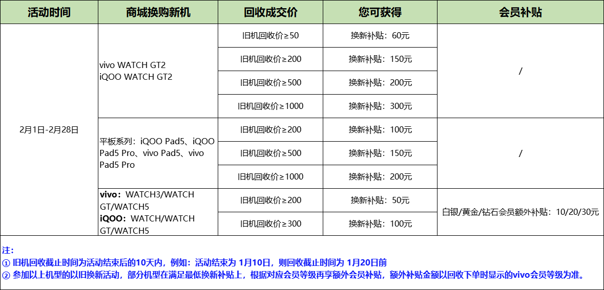 活动期间,参与vivo商城 以旧换新活动,旧设备回收成交价≥200元、≥500元、≥1000元等不同金额,并购买以下新机,可享受对应换新补贴+专属会员补贴: