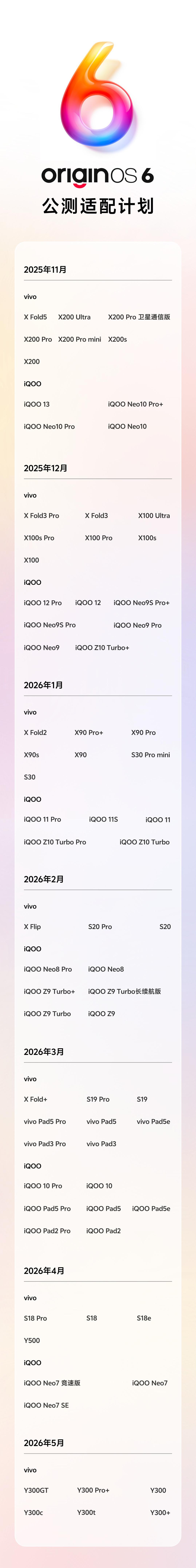 感谢您对于OriginOS 6的喜爱和关注!OriginOS 6公测适配计划如下: