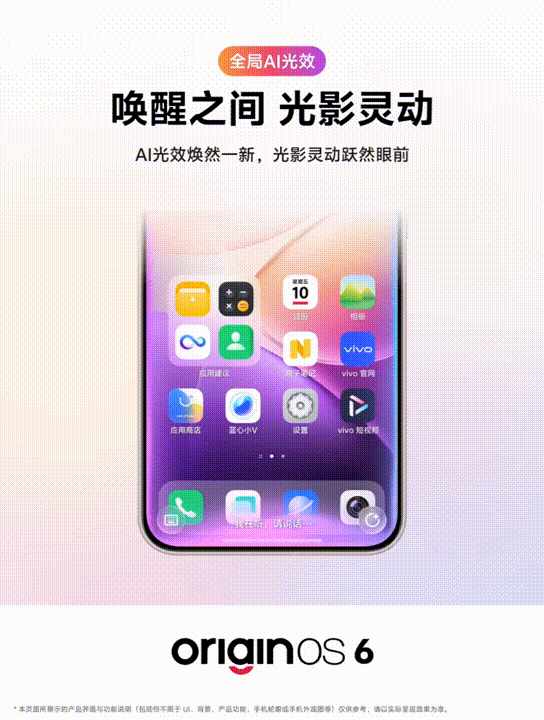 OriginOS 6支持“AI光效”,通过对 OriginOS AI的视觉效果升级,让用户在使用中感受到AI能力的强大与可靠。