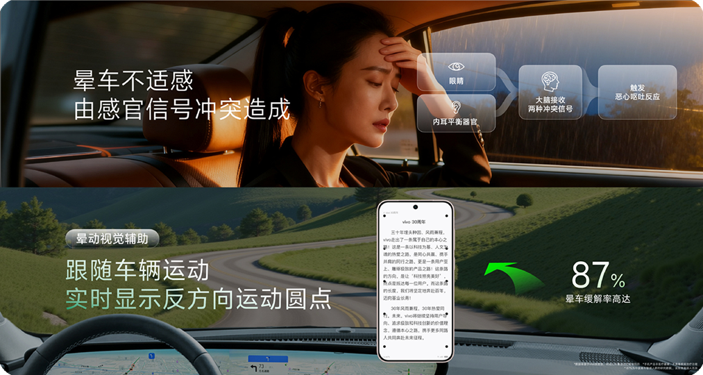 OriginOS 6支持晕动视觉辅助功能,屏幕两侧显示根据车辆不同运动状态而变化的圆点,以缓解注视屏幕所引起的晕车不适感。功能生效期间,设备的耗电及发热将会增加。