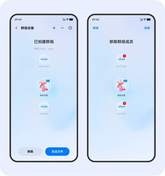 当您为群主时可以移出群组成员,其他普通成员无法移除他人。建立群组连接后,进入互传应用传送文件页面,在设备列表面板点击群组设备按钮进入群组管理页面,点击右上角“一”可移除群组成员。