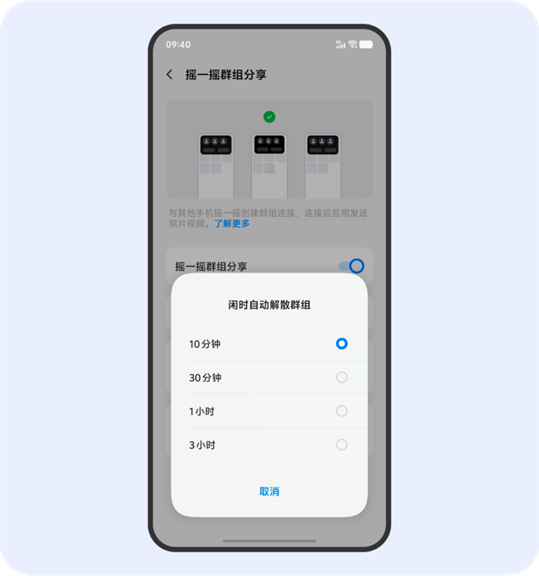 前往“互传>设置>摇一摇群组分享”可设置“闲时自动解散群组”时间,该设置仅针对群组有效,普通成员无效。