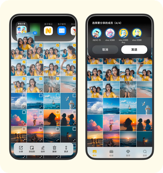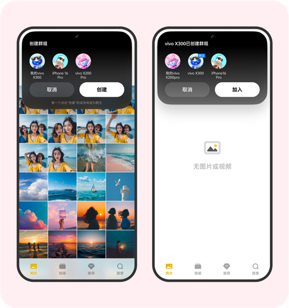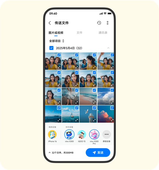 OriginOS 6支持“摇一摇群组分享”功能,vivo手机只需停留在互传、相册、文件管理或系统桌面界面,iPhone手机进入应用商店搜索并安装好“vivo互传”后,打开并停留在“互传”界面,需要分享的手机一起摇一摇就可以创建群组,群组创建成功后即可在相册选择任意数量的照片做分享,传图片/视频不消耗手机流量的同时可完成大批量高清图片的一次性传输。