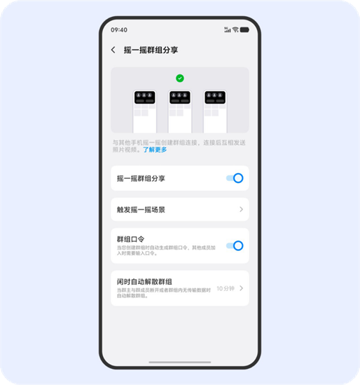 前往“互传>设置>摇一摇群组分享”可开启“群组口令”。开启后,您后续创建的群组将自动生成群组口令,其他成员需要输入群组口令才能加入群组。