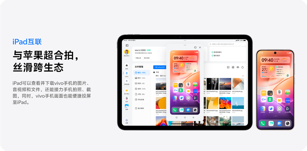 OriginOS 6支持“跨生态平板连接”功能,vivo手机和iPad连接后,支持以下跨屏协同功能: