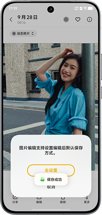 vivo手机在首次进行相册照片编辑保存时,会有“编辑后默认保存方式”弹窗提示,点击“去设置”即可进入图片和视频的保存方式设置。后期如需调整,可再次进入相册的设置中进行调整。